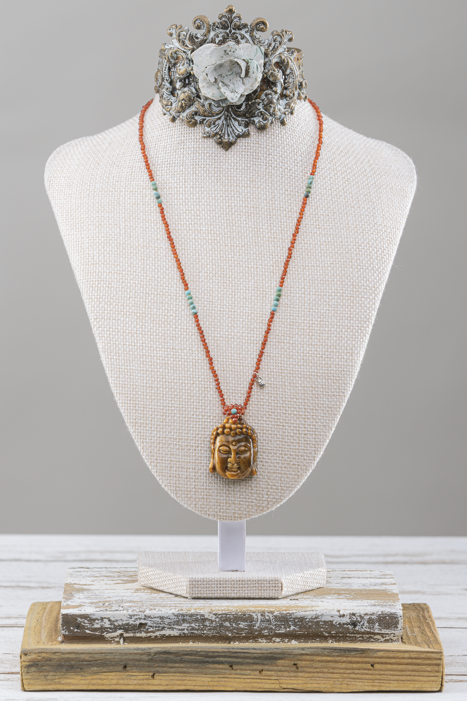 Para transmitir la vibración deseada con este collar, he añadido jaspe rojo y turquesa de la más alta calidad. La combinación de estos elementos potencia tanto la energía como el propósito del diseño, dando lugar a una pieza única que armoniza belleza y significado. Cada uno de los materiales lo he escogido cuidadosamente para reforzar la intención y el mensaje del collar, logrando así una joya que irradia fuerza y espiritualidad.
