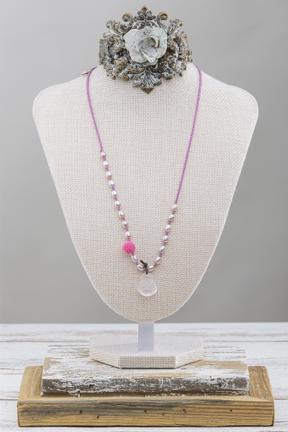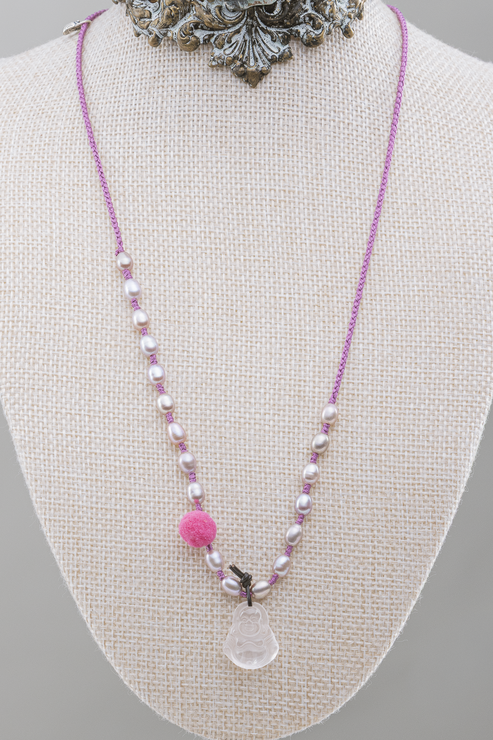 Estas perlas irresistibles las encontré en la isla Contadora en Archipiélago de Las Perlas, en el océano Pacífico de Panamá. Las he combinado con un precioso Budita de la felicidad de cuarzo Rosa.