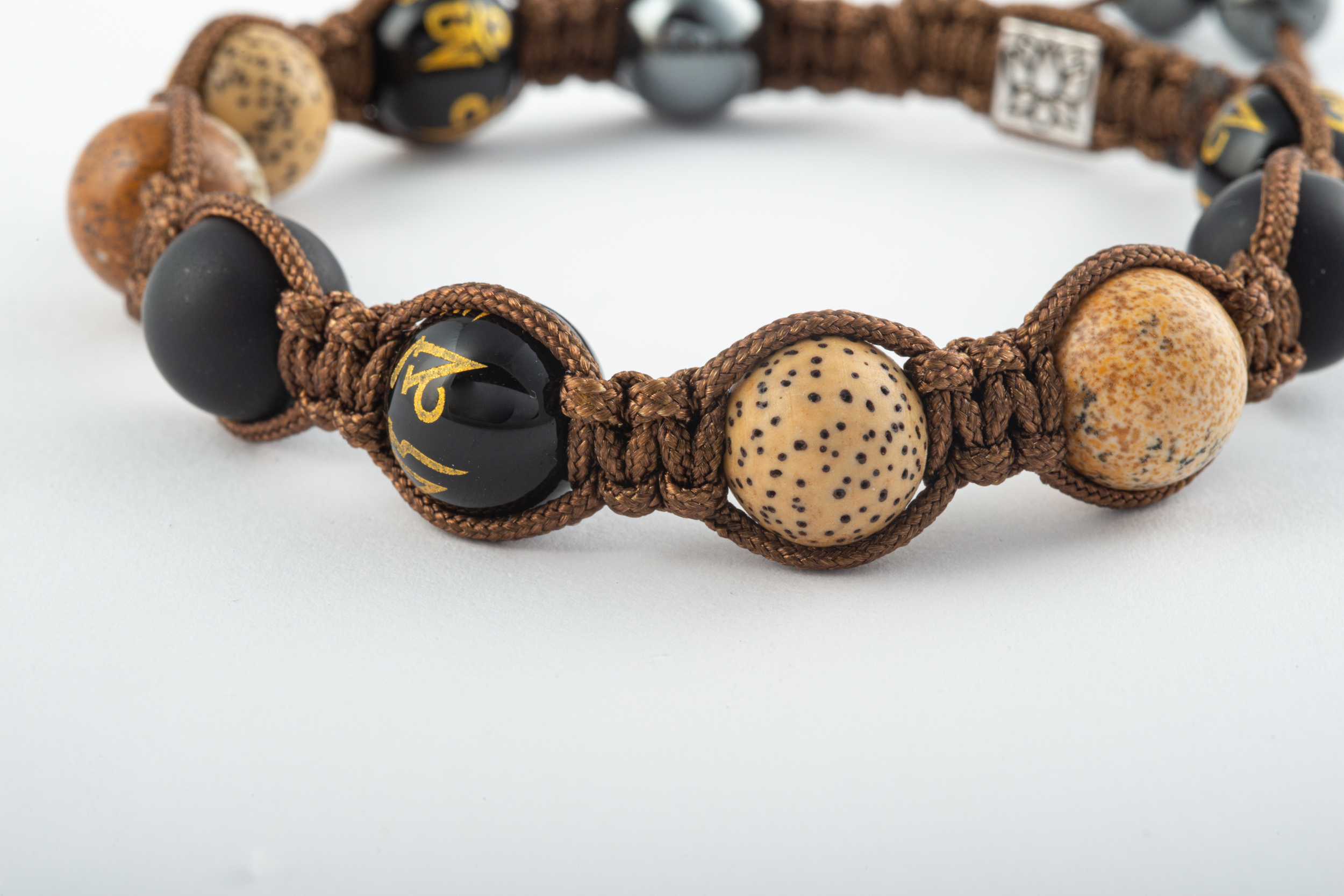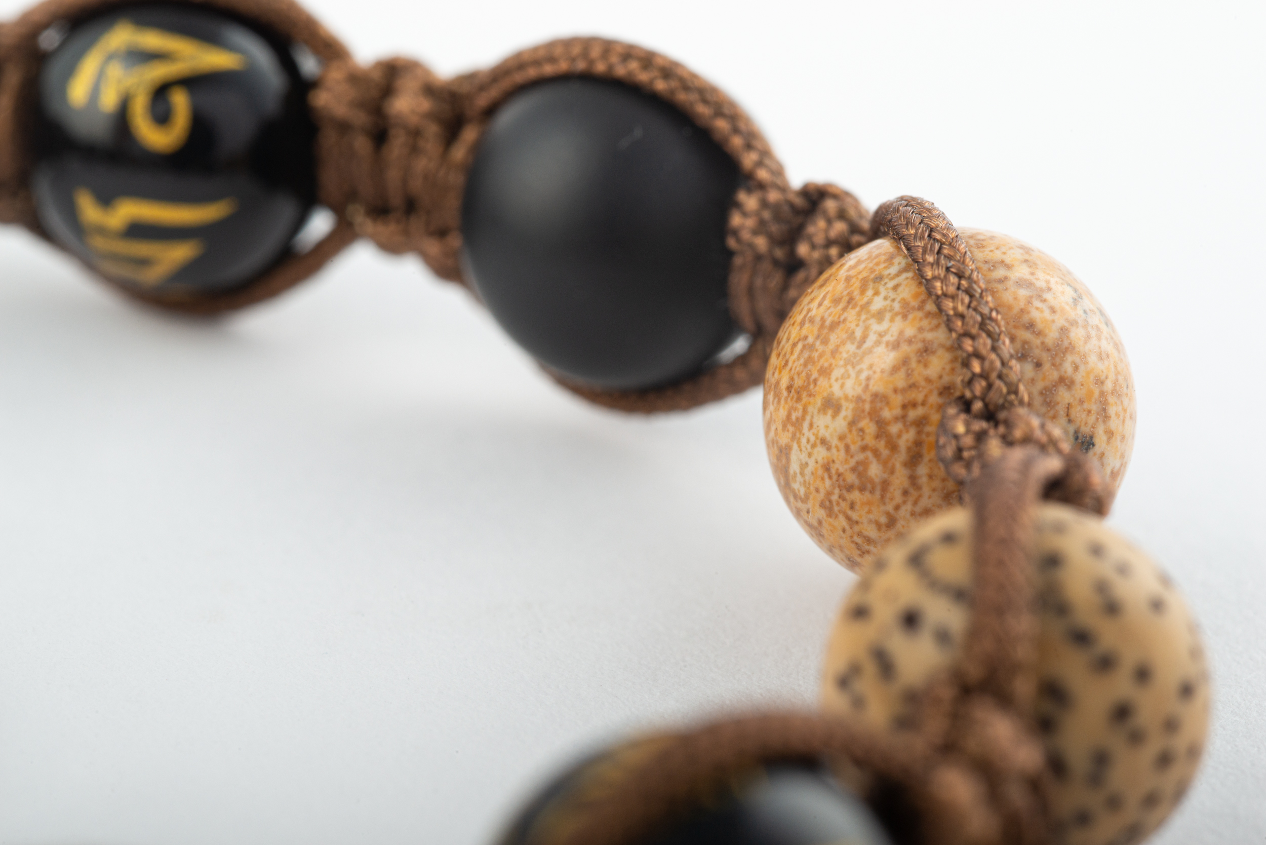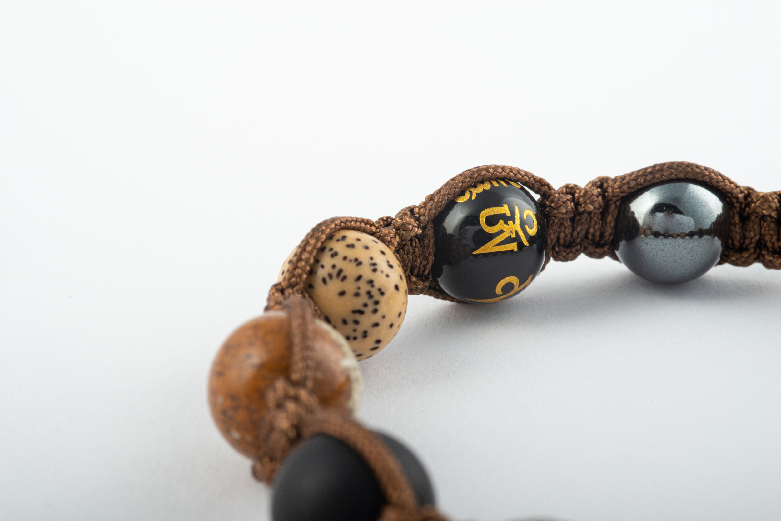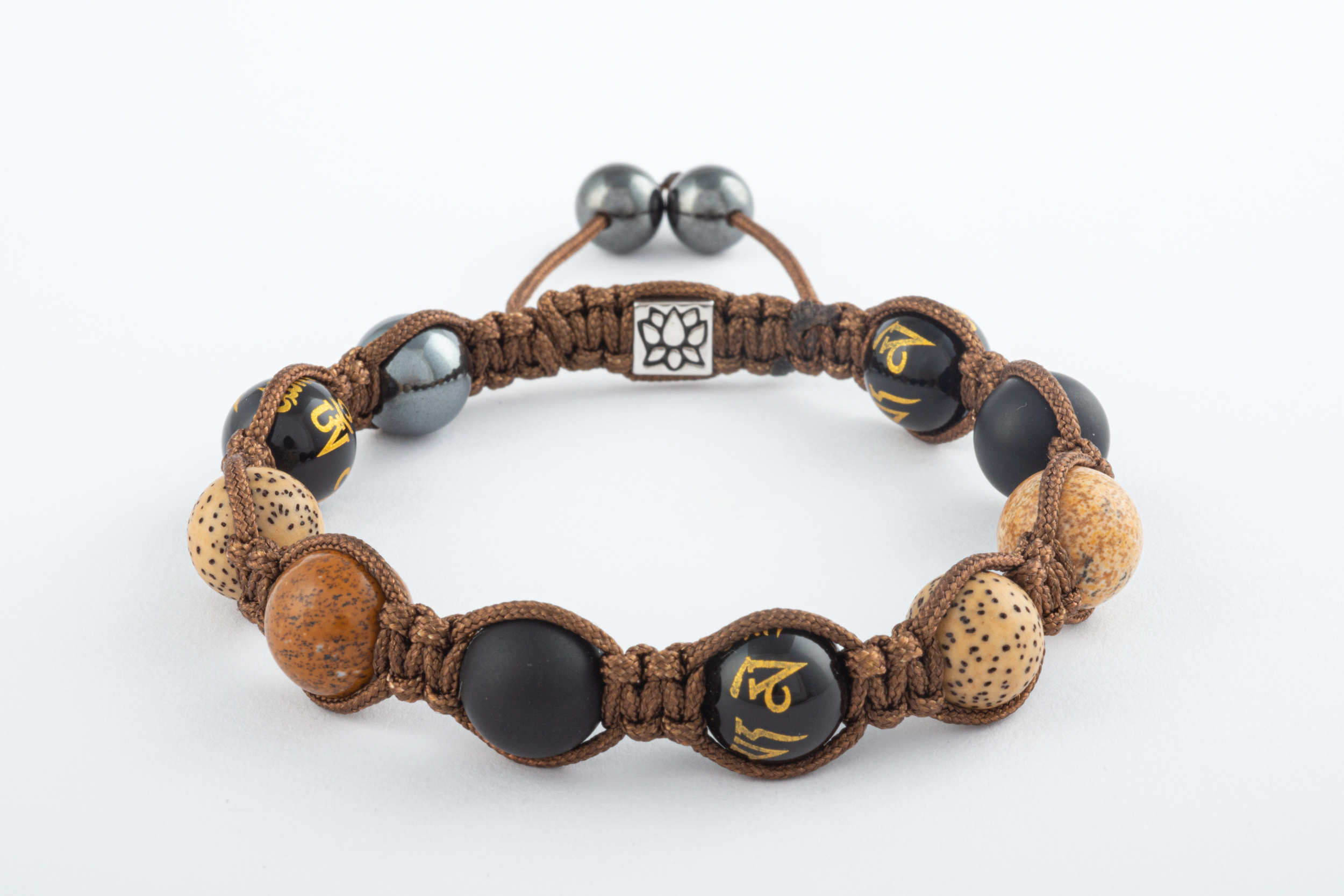 La pulsera encapsula tres de los más importantes mantras esenciales. Sus sílabas remiten a los seis pāramitās, o virtudes, trascendentales: la generosidad, la ética, la paciencia, la diligencia, la concentración y la sabiduría.